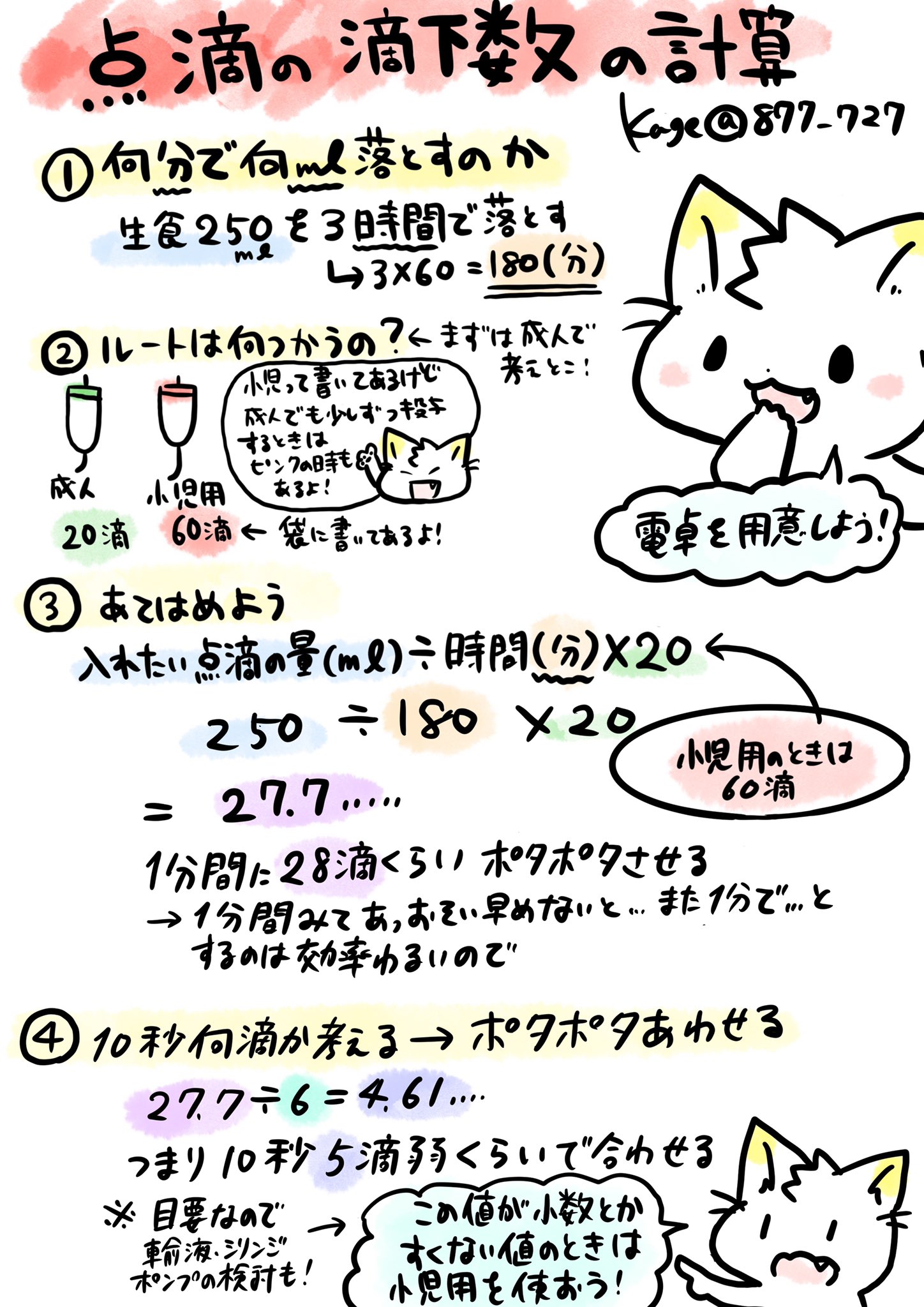 点滴静脈内注射の際に、滴下速度が変化したときは、次のような原因が考えられます。 ⑴ 滴下が速すぎる場合 ①患者が クランプ を動かした、②静脈針と輸液チューブの接続が外れている、③患者の体位変化や血圧の変化、④針先位置が一定していない。人の血液量の計算 健康寿命の計算 点滴の滴下数の計算 酸素ボンベの残量計算 出生時の平均体重 検査の精度 例えば500mlの輸液を5時間かけて落とす時の計算で 500(ml)÷5(時間)÷3で1分間の滴下数、更に÷6で10秒に落ちる滴下数が出ると教えてもらいました。 しか し1秒に落ちる滴下数や、2秒に1滴の求め方、3秒に1滴の求め方が分かりません。